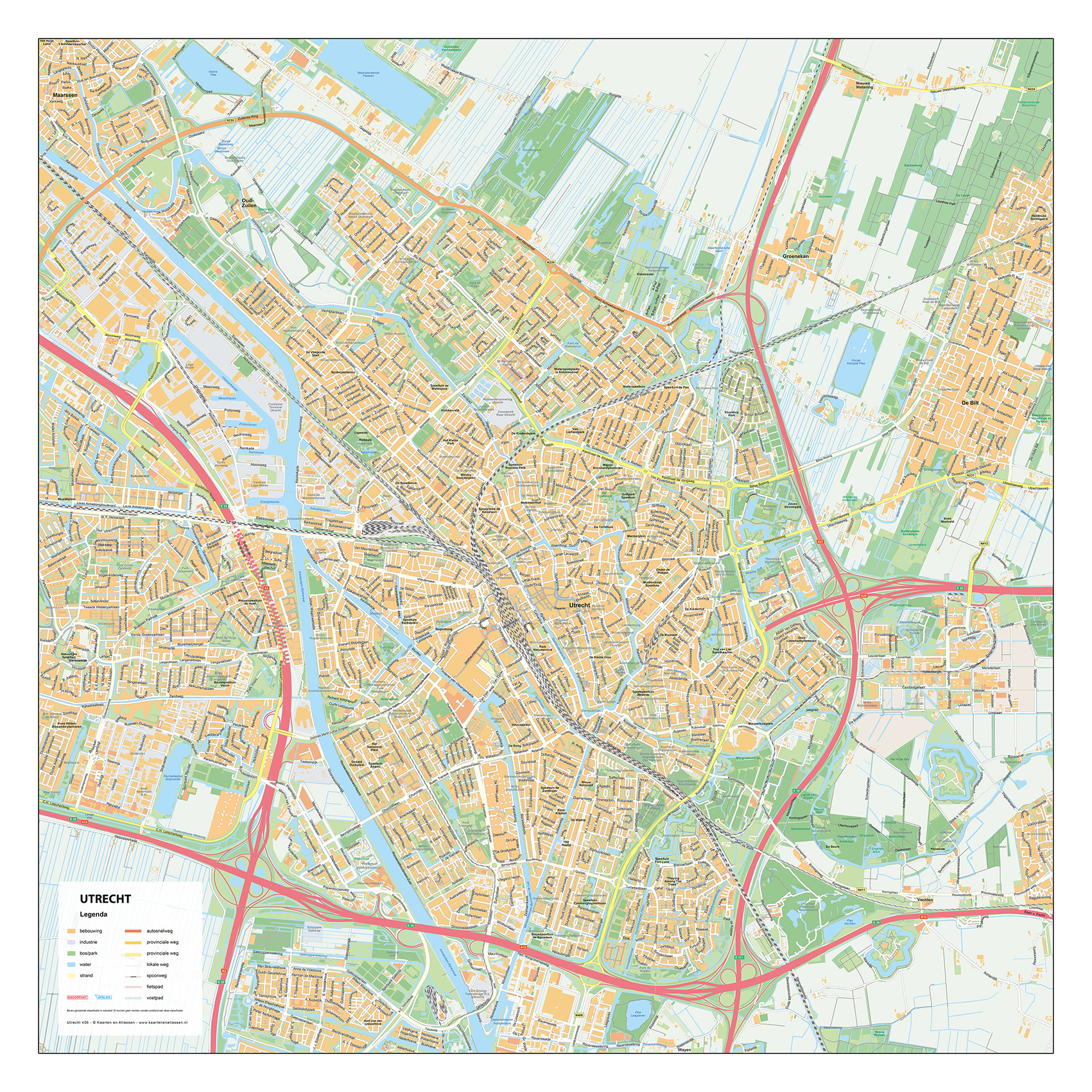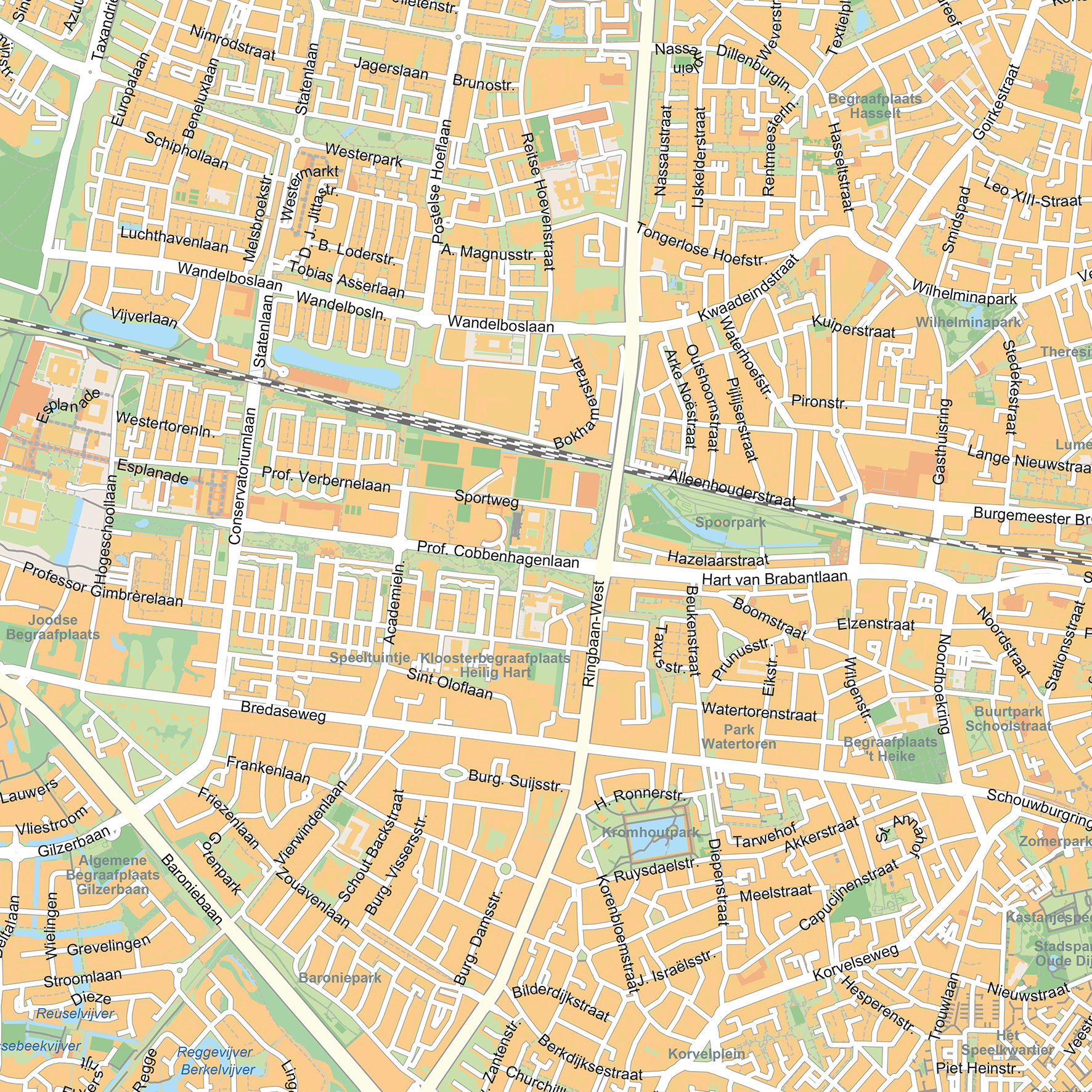Deze gedetailleerde stedenkaart van Tilburg laat de verschillende wijken van de stad goed zien, van het bruisende centrum met zijn winkelstraten en pleinen tot de groene buitenwijken en industrieel erfgoed. Straten, parken en waterpartijen zijn helder weergegeven, waardoor de stedelijke structuur van Tilburg overzichtelijk en compleet in kaart is gebracht. De kaart is beschikbaar als wandkaart of digitaal bestand en biedt een compleet overzicht van deze Brabantse stad. Bekijk ook onze andere stadsplattegronden van Nederland.