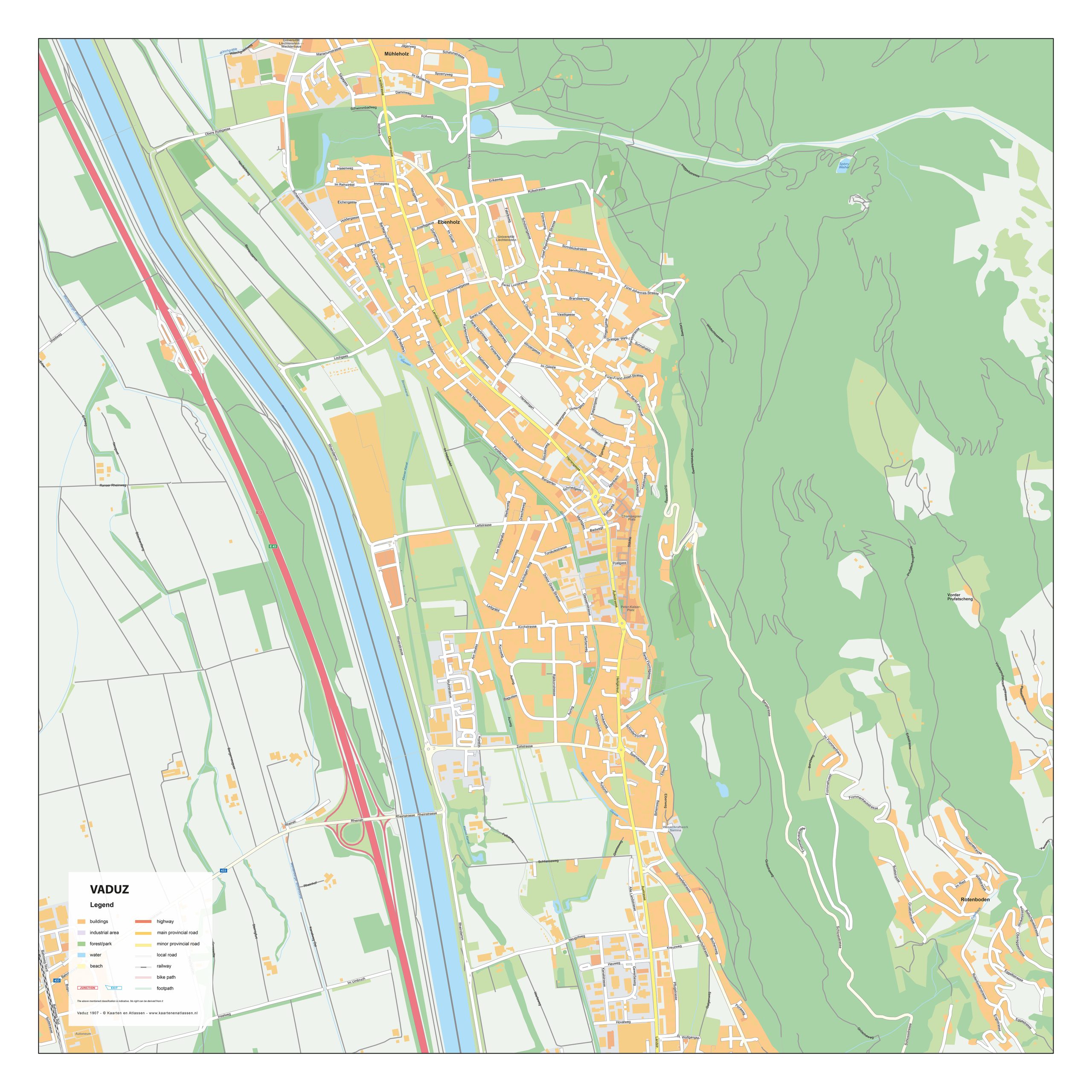 Deze stadsplattegrond van Vaduz toont de kleine hoofdstad van Liechtenstein, gelegen aan de voet van de Alpen. Het compacte stadscentrum met zijn hoofdstraat, musea en het kasteel is duidelijk weergegeven, omgeven door groene heuvels en bergen. De kaart is beschikbaar als wandkaart of digitaal bestand en biedt een helder overzicht van deze unieke, bergachtige stad. Bekijk ook onze andere stadsplattegronden van Europese hoofdsteden.