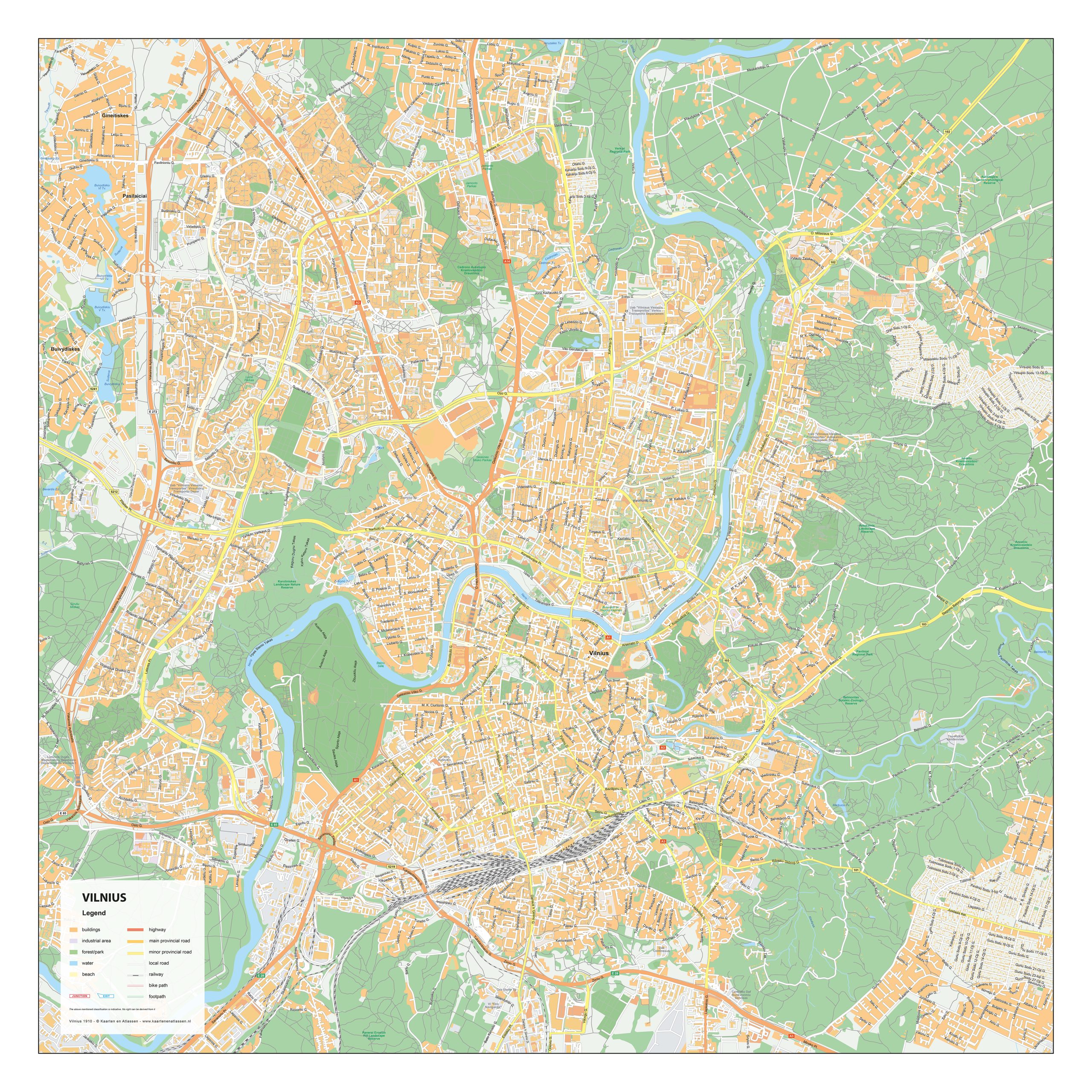 Deze stadsplattegrond van Vilnius toont de Litouwse hoofdstad met haar sfeervolle historische binnenstad, smalle straatjes en pleinen. Ook de groene zones rondom de stad zijn duidelijk weergegeven, evenals de rivier de Neris die door het centrum stroomt. De kaart is beschikbaar als wandkaart of digitaal bestand en biedt een compleet overzicht van deze charmante en groene stad. Bekijk ook onze andere stadsplattegronden van Europese hoofdsteden.