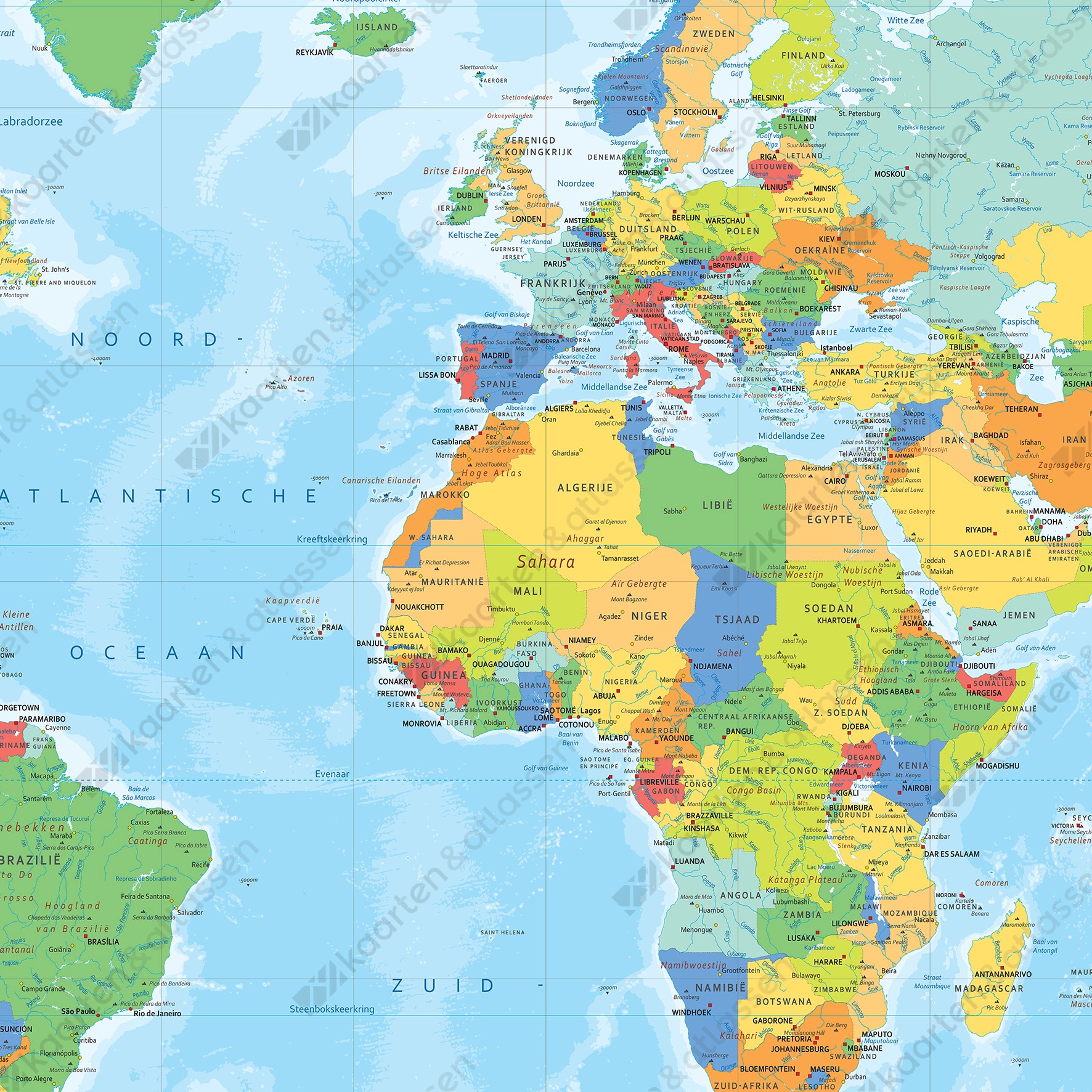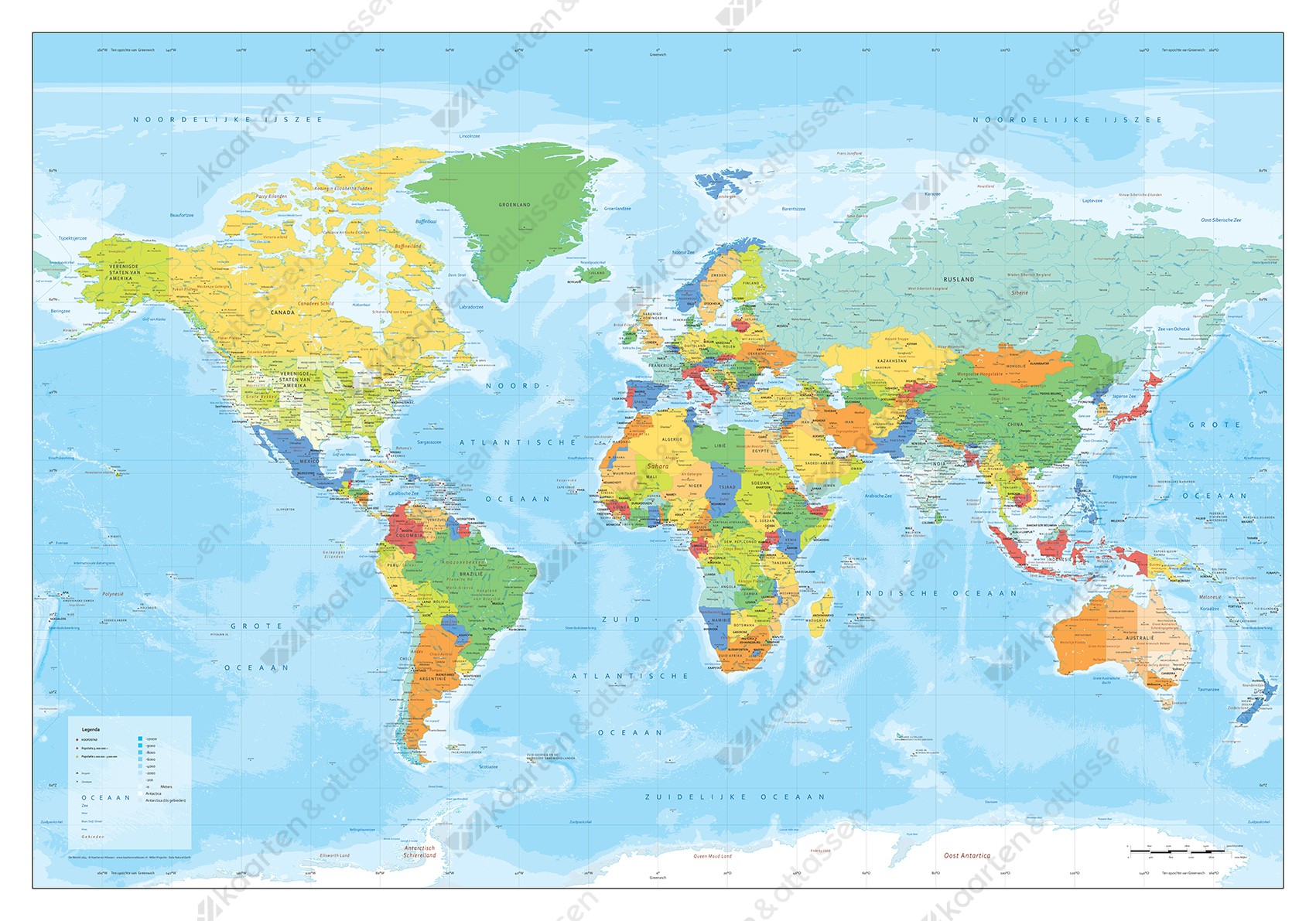 Wereldkaart in moderne uitvoering in de Nederlandse taal. Een zeer gedetailleerde kaart die ook nog goed leesbaar is op de iets kleinere formaten. Naast steden en landen zijn ook van de US, India en Australië de staten weergegeven. De kaart is in heldere kleuren vormgegeven. Alle teksten staan duidelijk in de kaart. De kaart is in de Miller projectie weergegeven. Andere uitvoeringen zoals behang zijn mogelijk. De kaart is ook in grotere formaten te bestellen. Voor de grotere formaten 175×120 cm en 200×140 cm zie de XXL kaart.