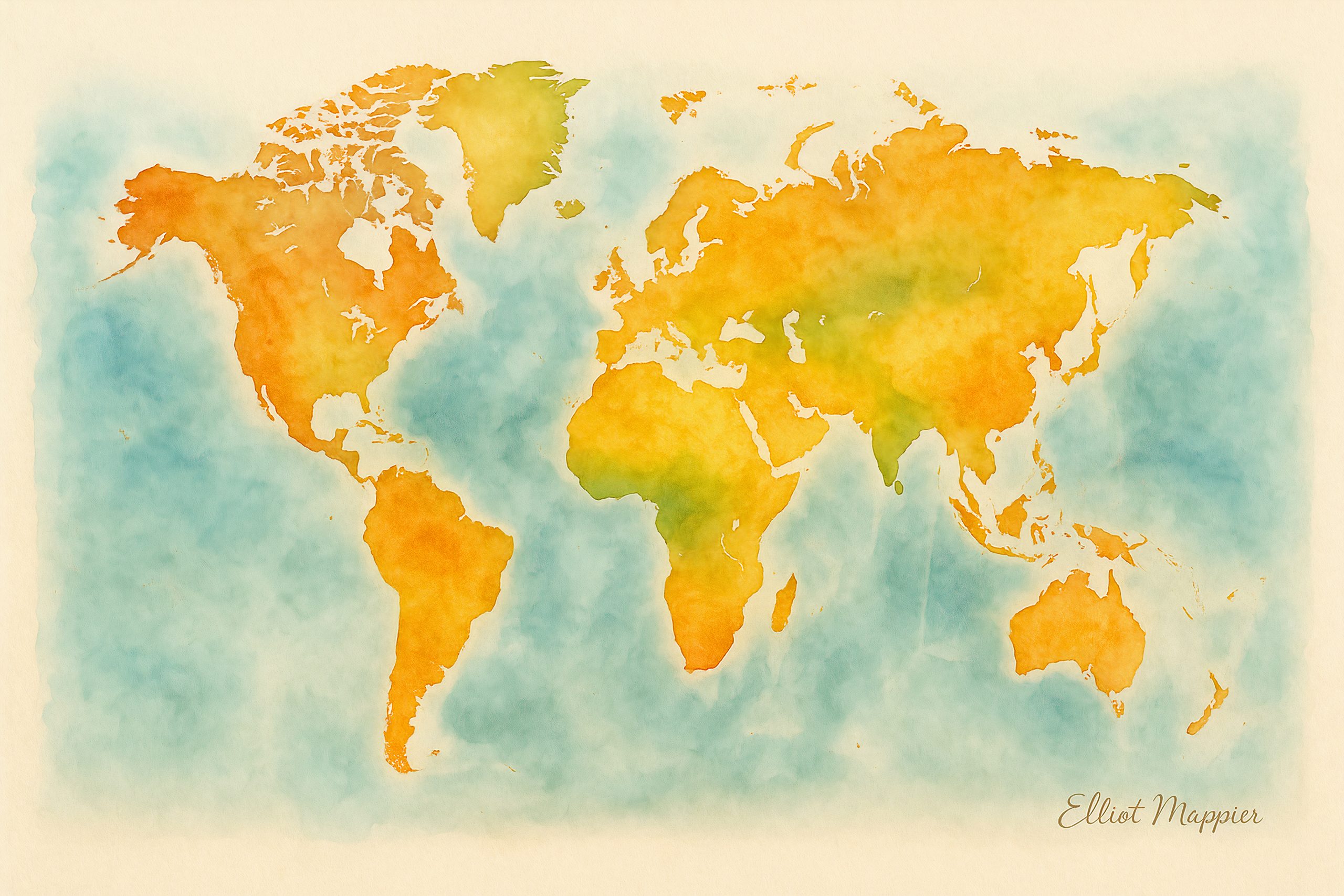Deze aquarel wereldkaart is uitgevoerd in een combinatie van warme oranje tinten en zachte blauwtinten, wat zorgt voor een evenwichtig en levendig beeld. De continenten zijn duidelijk herkenbaar, terwijl de kleurverlopen subtiel in elkaar overlopen en de kaart een handgeschilderde uitstraling geven. Het contrast tussen het warme land en het koelere water geeft diepte zonder dat het beeld onrustig wordt. De lichte structuur van aquarelpapier blijft zichtbaar en draagt bij aan een natuurlijke en tijdloze uitstraling. Deze wereldkaart past goed in uiteenlopende interieurs en vormt een decoratief element met een rustige maar karaktervolle uitstraling.