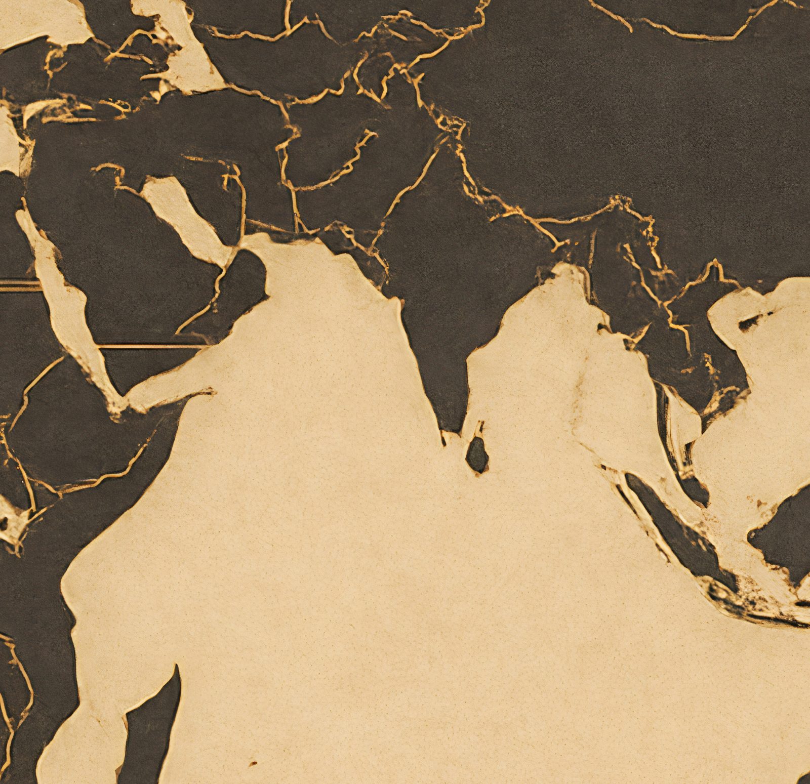 Deze retro wereldkaart is uitgevoerd in een ingetogen kleurenpalet van donker antraciet, warme grijstinten en fijne messingaccenten. De continenten vormen krachtige vlakken tegen een licht verouderde papierachtergrond, wat de kaart een rustige en luxe uitstraling geeft. Subtiele landgrenzen zorgen voor detail en structuur zonder het beeld te domineren. Het geheel is geïnspireerd op cartografie uit het midden van de twintigste eeuw, waarbij eenvoud en balans centraal staan. Door het sobere kleurgebruik en de verfijnde afwerking is deze wereldkaart geschikt als decoratief element in uiteenlopende interieurs, waar zij een tijdloos en karaktervol accent toevoegt.