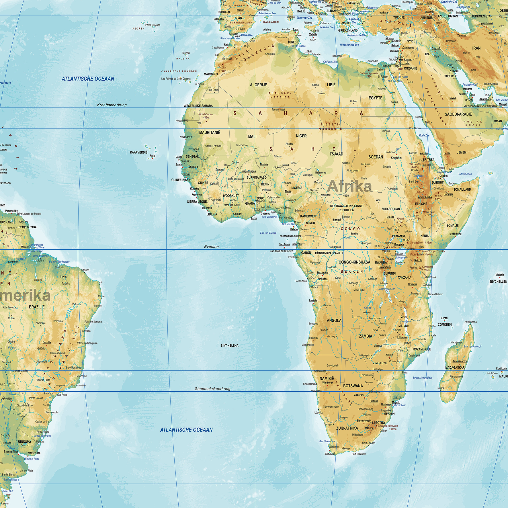 Deze natuurkundige wereldkaart in Equal Earth projectie toont de aarde met grote nauwkeurigheid en een natuurlijke weergave van continenten en oceanen. Hoogteverschillen, gebergten en zeeën zijn duidelijk zichtbaar en geven een helder beeld van de fysieke kenmerken van onze planeet. De kaart is voorzien van een duidelijke legenda en is geschikt voor zowel educatief gebruik als decoratieve toepassingen. Beschikbaar in diverse uitvoeringen en formaten, zodat de kaart goed aansluit bij verschillende wensen. De staatkundige equal Earth wereldkaart is ook verkrijgbaar evenals de schoolkaart versie. Lees meer over deze projectie in onze blog.