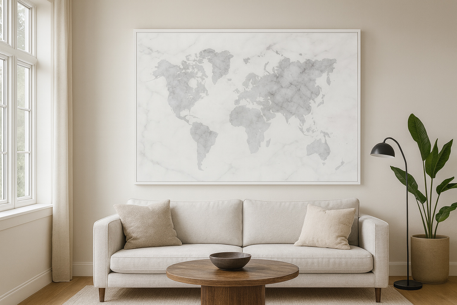 Deze wereldkaart is volledig opgebouwd uit een marmerstructuur met zachte, grijze aders die rustig over het beeld lopen. De lichte steentinten geven het ontwerp een minimalistische en serene uitstraling. De continenten vloeien subtiel samen met de achtergrond, waardoor een rustige en moderne compositie ontstaat. Dit ontwerp sluit goed aan bij lichte, Scandinavische en strak ingerichte interieurs waarin natuurlijke materialen centraal staan.
