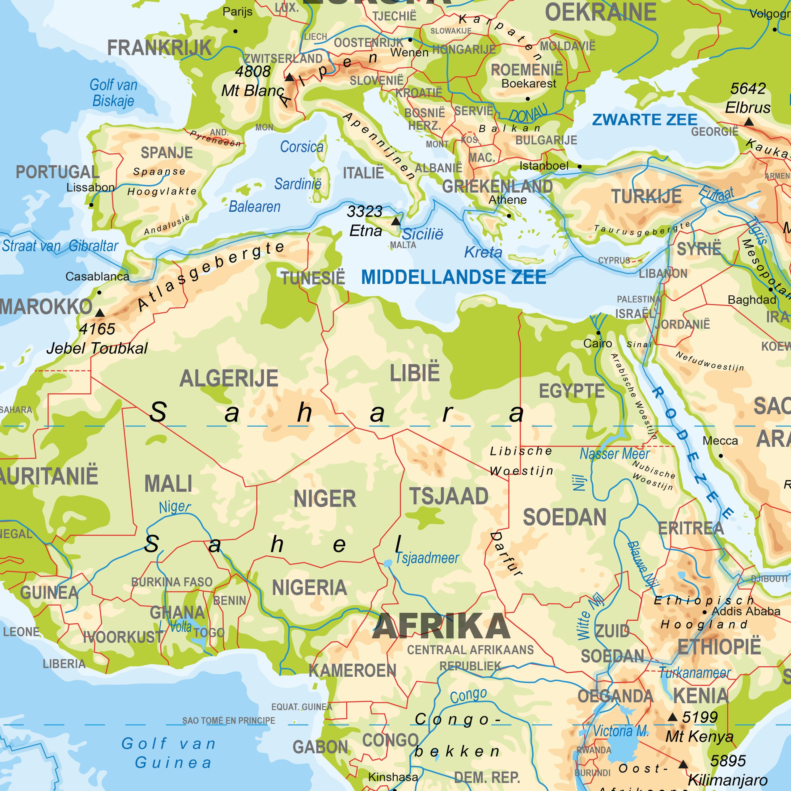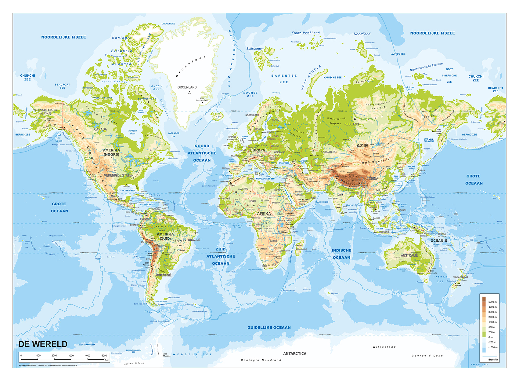 Digitale natuurkundige wereldkaart uitgevoerd in de Nederlandse taal. Deze wereldkaart is duidelijk; alle landen, hoofdsteden, grotere wateren en eilanden zijn afgebeeld. Alle hoogtes zijn duidelijk op de wereldkaart weergegeven. De breuklijnen zijn de lijnen die de aardkorst in meerdere stukken verdelen, ook wel tektonische platen genoemd. De aarde bestaat uit 9 verschillende grote platen, en nog een paar kleinere platen. Deze wereldkaart is uitermate geschikt voor (middelbare) scholen, kinderkamers maar ook voor mensen die op zoek zijn naar een duidelijke natuurkundige wereldkaart. De eenvoudige wereldkaart natuurkundig 1301 heeft geen breuklijnen en daardoor een rustiger kaartbeeld.