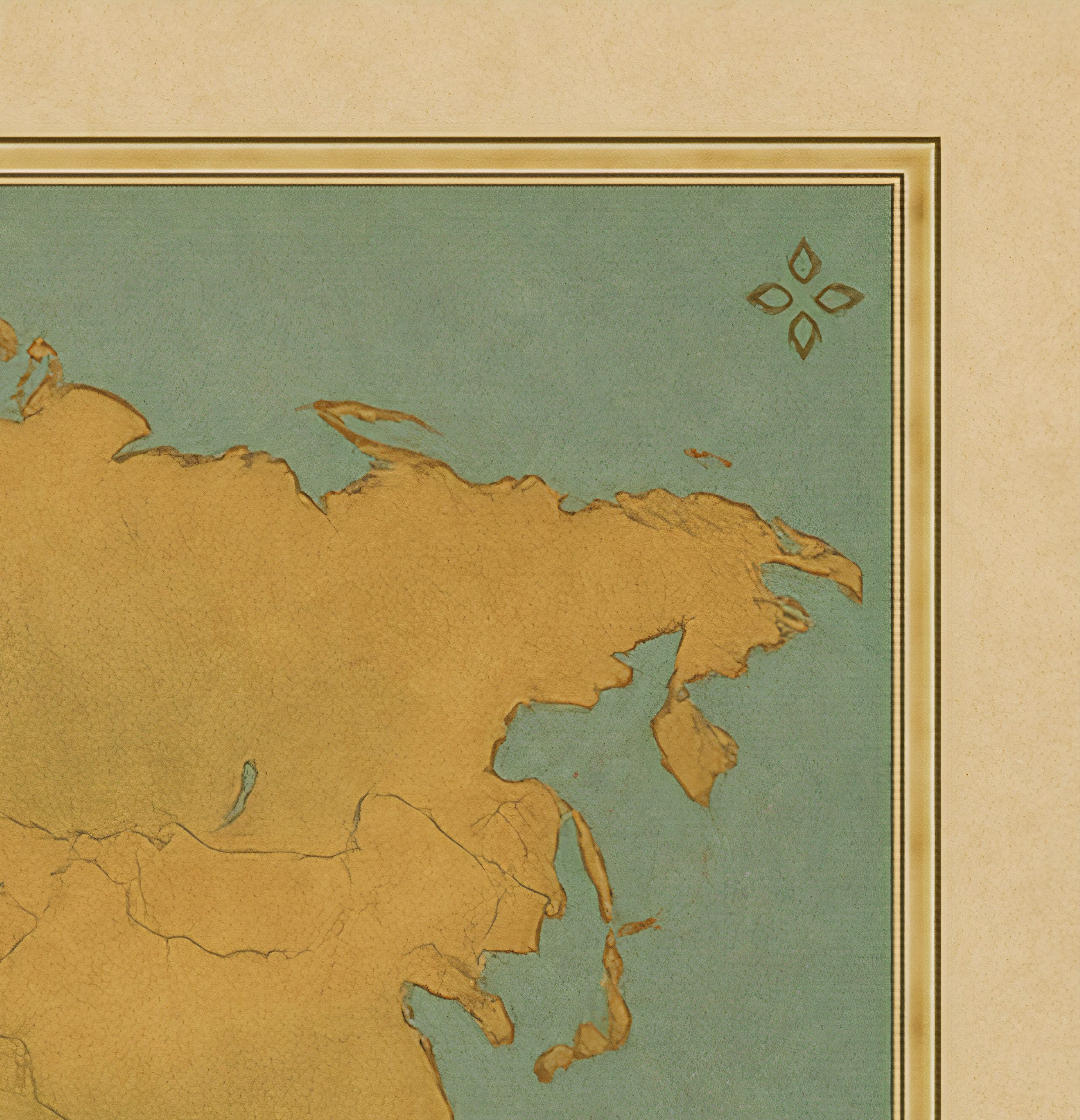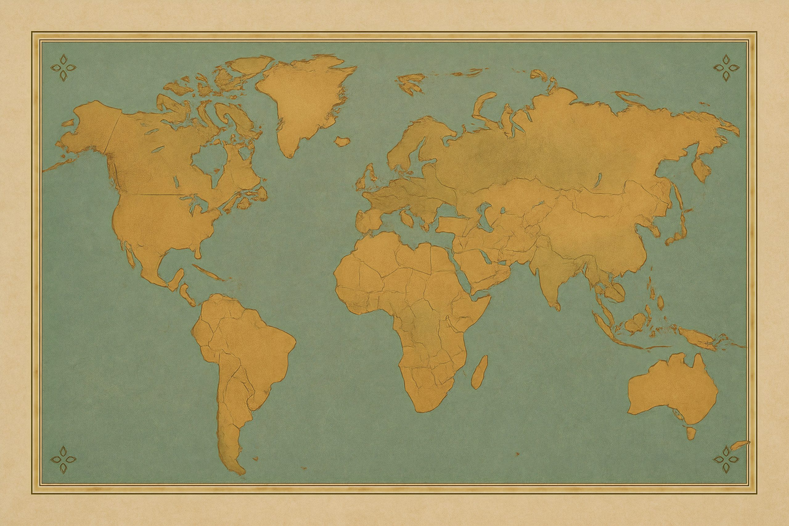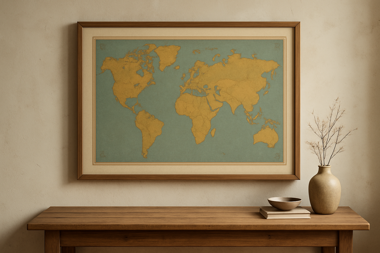 Deze retro wereldkaart is uitgevoerd in zachte okertinten voor de continenten, gecombineerd met een gedempte blauwgroene oceaankleur. De kaart heeft een rustige balans tussen detail en eenvoud, waarbij de landsgrenzen subtiel maar duidelijk zichtbaar zijn. In deze interieurweergave hangt de kaart in een houten lijst tegen een lichte, verouderde muur. Het natuurlijke licht en de sobere inrichting met keramiek en hout versterken het ingetogen karakter van de kaart. Het geheel straalt rust en tijdloosheid uit en benadrukt de klassieke cartografische vormgeving zonder overheersende elementen.