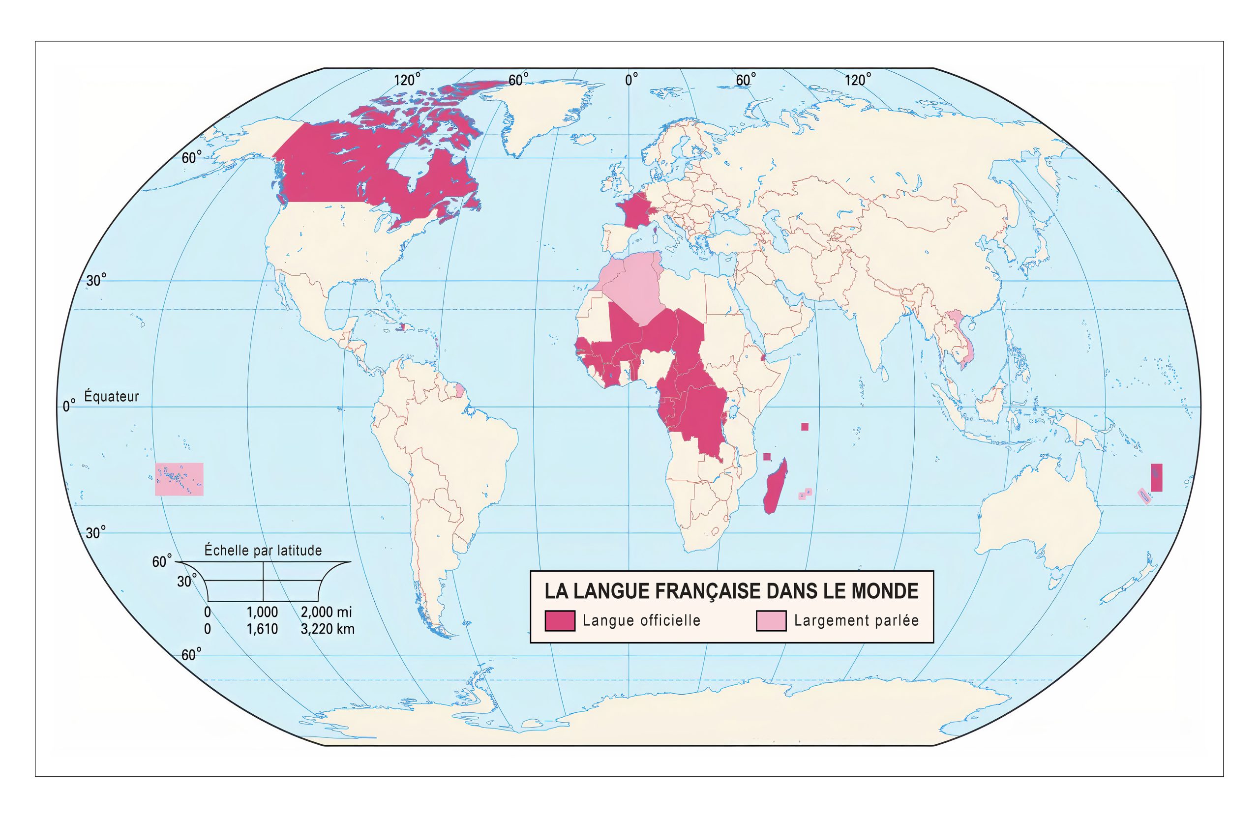 Deze wereldkaart toont de verspreiding van de Franse taal wereldwijd. In het donkerroze zijn landen aangeduid waar Frans een officiële taal is, terwijl lichtroze gebieden aanduiden waar Frans wijdverspreid gesproken wordt. De kaart geeft een duidelijk overzicht van de invloed van de Franse taal, vooral in Europa, Afrika, Noord-Amerika en delen van Oceanië. Ideaal voor educatieve of informatieve doeleinden.