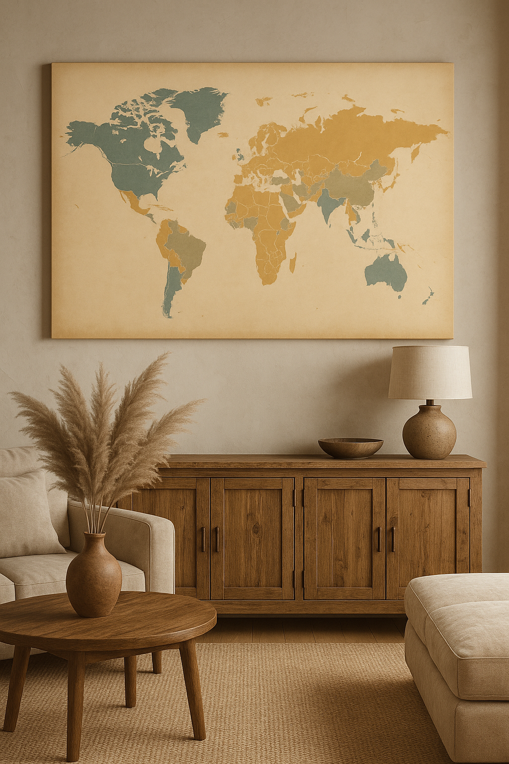 Deze wereldkaart is vormgegeven in een uitgesproken retrostijl, geïnspireerd op midden-20e-eeuwse cartografie. De kaart maakt gebruik van warme aardetinten zoals zacht oker, vergrijsd blauw en subtiele zandkleuren, gecombineerd met een licht verouderde papierstructuur. De continenten zijn helder weergegeven als rustige kleurvlakken, met fijne landgrenzen die zorgen voor extra detail zonder het beeld druk te maken. Door het uitgebalanceerde kleurgebruik en het nostalgische karakter past deze wereldkaart goed in zowel moderne als klassieke interieurs. De kaart is ontworpen als decoratief object, waarbij sfeer en vorm belangrijker zijn dan technische cartografische precisie.