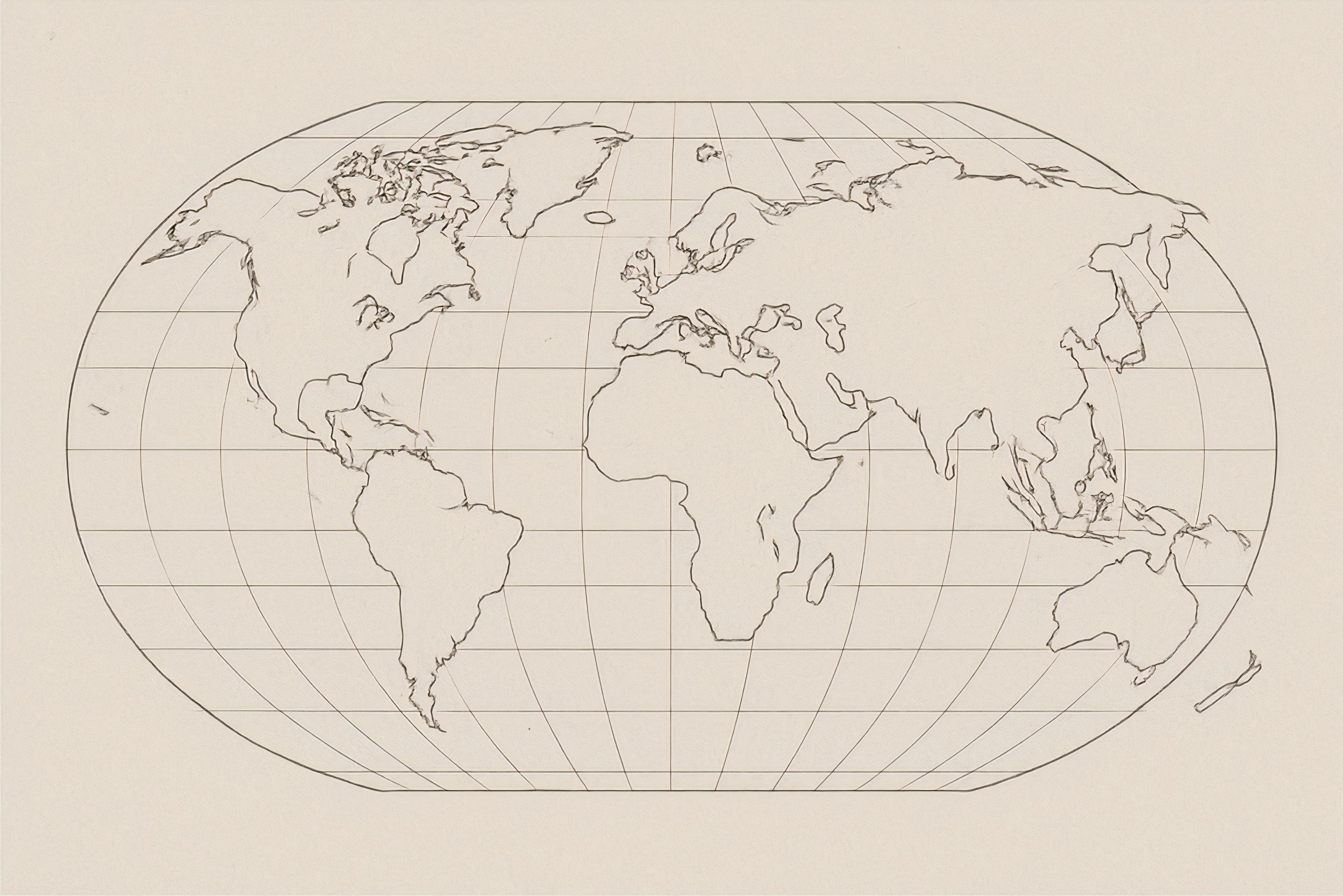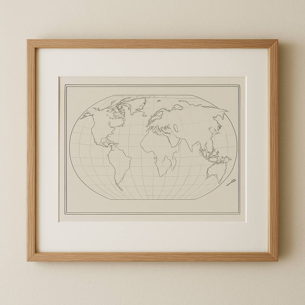 Deze wereldkaart is uitgevoerd in een pen-and-ink illustratieve stijl, geïnspireerd op handgetekende atlasillustraties en reisjournalen. Het lijnwerk is vloeiend en licht, met minimale arcering en een natuurlijke variatie in lijnsterkte. Daardoor ontstaat een open en toegankelijke kaart waarin vorm en beweging centraal staan. De continenten zijn herkenbaar en zorgvuldig getekend, zonder tekst of aanvullende symbolen. Het geheel ademt een verkennend karakter, alsof de kaart direct met pen op papier is vastgelegd tijdens een reis. Deze stijl combineert cartografische herkenbaarheid met een persoonlijke, illustratieve uitstraling.