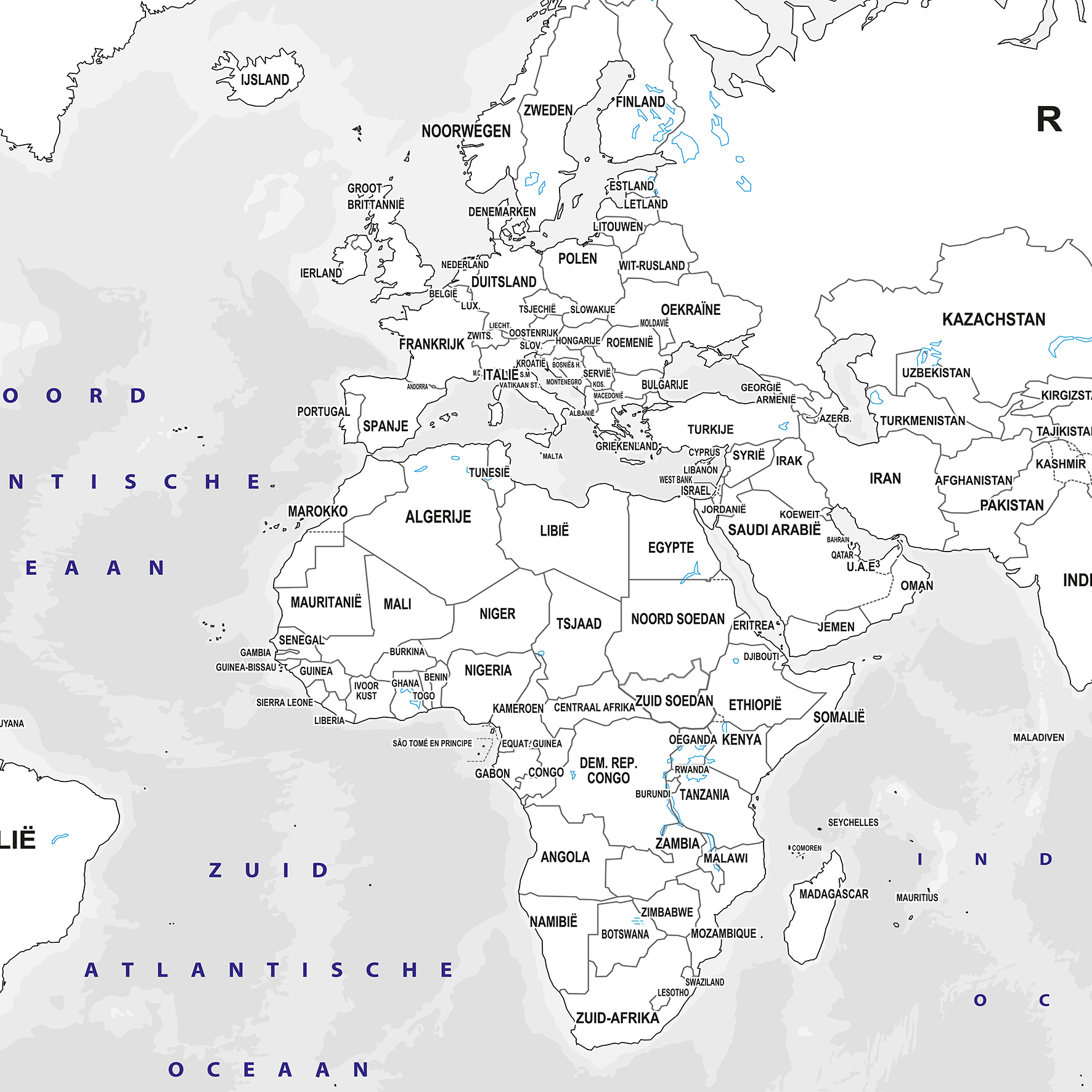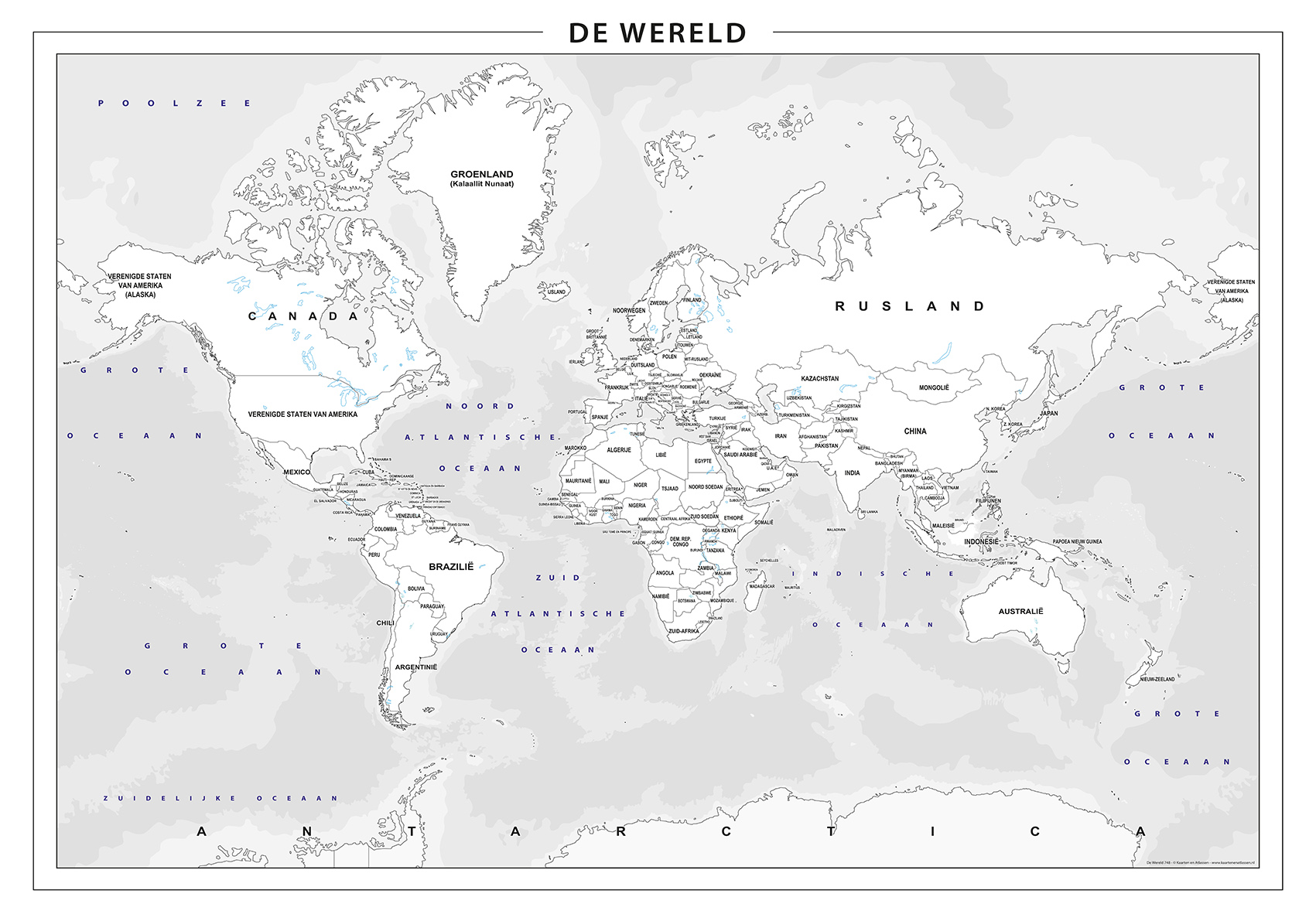 Overzichtelijke Nederlandstalige wereldkaart met landsgrenzen en land namen. De kaart is grotendeels wit gehouden, waardoor je hem eenvoudig zelf digitaal of met de hand kunt inkleuren of invullen. Perfect voor educatieve doeleinden, presentaties, of creatieve projecten. Je kunt landen bijvoorbeeld verschillende kleuren geven, regio’s markeren of eigen notities toevoegen.